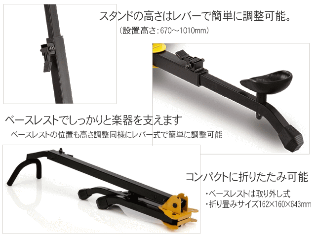 楽器の安定性を最優先しスタンドとしての機能を十分に果たしながらも、折りたたみ式でコンパクトになるバスクラ用スタンドです。