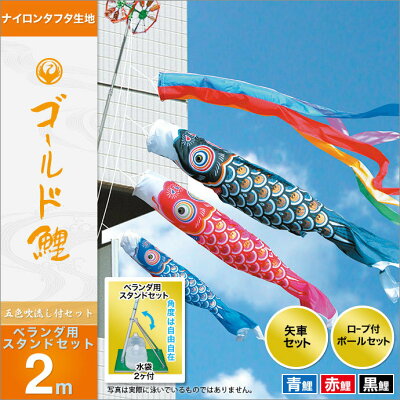 【鯉のぼり】徳永鯉のぼり ベランダ用 セット各種(矢車・ポール付) 鯉のぼり 2m 「ゴールド鯉 ベランダ用スタンドセット(水袋)」(ベランダ用・スタンドタイプ)(ナイロンタフタ生地使用)五月五日の端午の節句に、鯉が急流の滝を登ると龍となって出世するという「登龍門伝説」のように、男児の立身出世を願うために鯉のぼりを揚げてお祝いします。